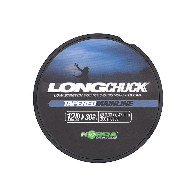De Long Chuck Tapered Mainline is ontwikkeld om ver te werpen in situaties waarbij je wilt vissen zonder voorslag. Denk hierbij bijvoorbeeld aan wateren met flink wat wier dat rond de voorslagknoop op kan hopen en zo tijdens de dril voor problemen kan zorgen. De Long Chuck Tapered Mainline komt op een 300m spoel met op beiden uiteinden een 8m lange sectie van 0.47mm (30lb) diameter lijn die tijdens harde worpen de klap opvangt – plus een 2m tapered deel naar de gekozen diameter lijn. De uiteinden van de lijn zijn zo hetzelfde en geven de mogelijkheid om bij onverhoopte breuk de lijn om te spoelen en draaien naar een andere spoel en zo verder te gebruiken. Deze tapered hoofdlijn heeft dezelfde eigenschappen als de Long Chuck lijn. Zo is het rekpercentage ultra laag om tijdens de worp meer druk te zetten op de hengel (zwaar nylon heeft normaal meer rek en hindert zo met werpen); lage water absorptie; licht gewicht voor de trekkracht doordat de lijn kleurloos is (kleurstof voegt extra gewicht toe), waardoor de lijn langer in de lucht blijft en een hoge trekkracht tot diameter verhouding om weerstand te verminderen. Hij komt naar keuze in 10-30lb (0.27-0.47mm); 12-30lb (0.30-0.47mm); en 15-30lb (0.33-0.47mm).