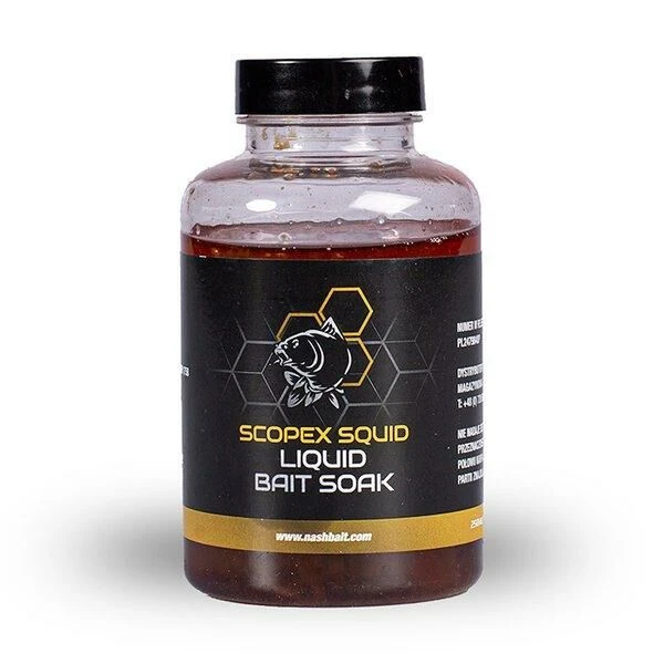 De Nash Scopex Squid Liquid Bait Soak is een PVA vriendelijke liquid dip vol legendarische Scope Squid Attractors. Te gebruiken als dip, om PVA-sticks aan te maken of om pellets, drijvend aas en boilies te soaken. Kan niet overgedoseerd worden. perfect in combinatie met andere Scopex Squid producten van Nash